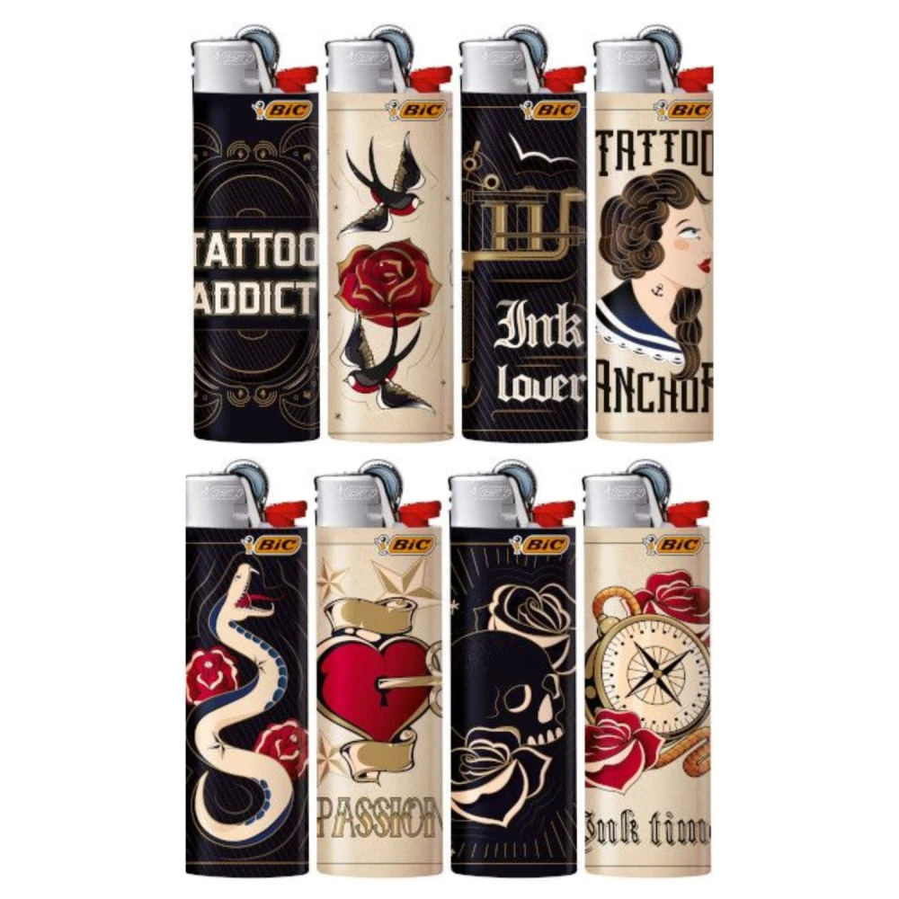 Barquette de 50 briquets BIC J26 Maxi avec des illustrations aux motifs Tattoo. Briquets à pierre et à gaz, 8 modèles différents