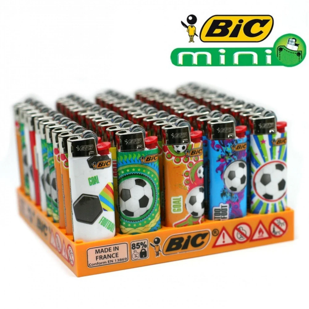Lot de 50 briquets Mini Bic à petits prix avec des motifs differents sur le thème du football pour les passionnés du ballon rond.