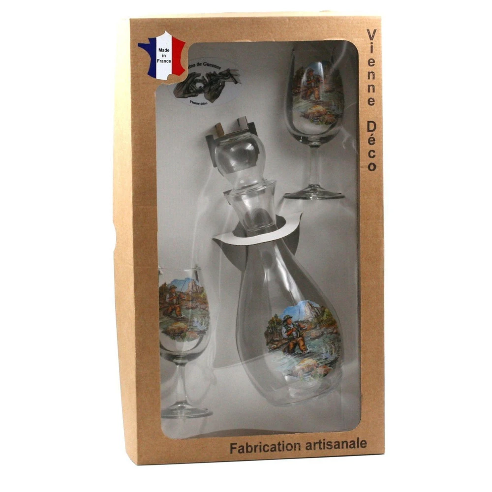 Coffret muni d’une carafe et de 2 verres à vin sérigraphie pêche à la mouche, fabrication artisanale française