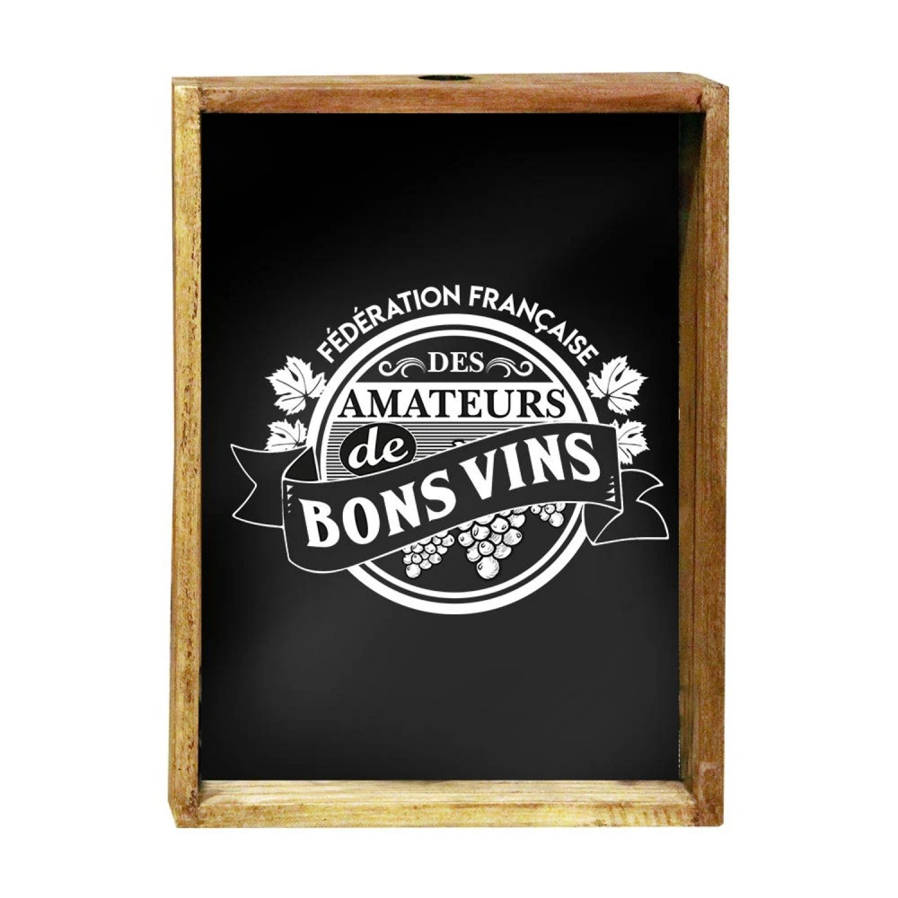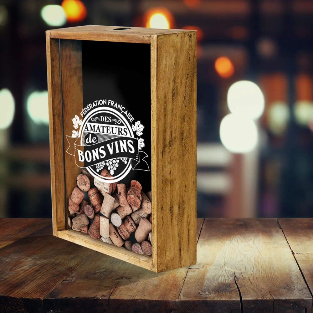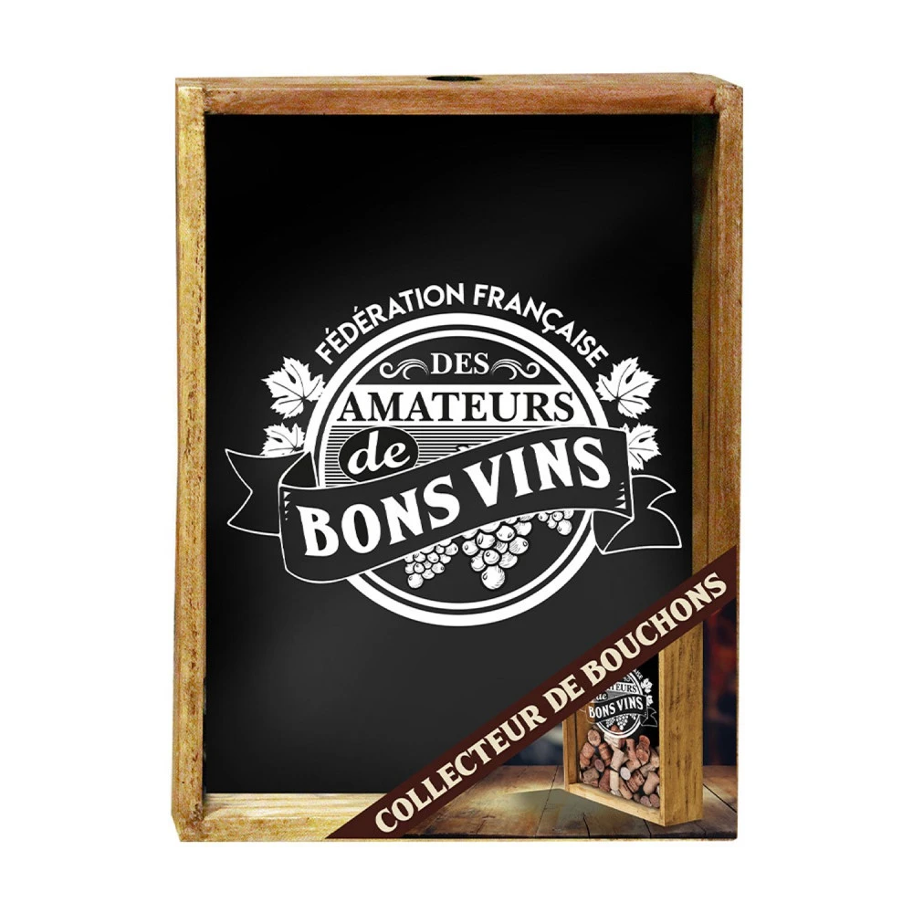 La fédération Française des amateurs de bons vins est heureuse de vous présenter ce collecteur à bouchons de liège pour amateur de raisin. Insérez les bouchons via le trou situé au dessus de la boite en bois. Admirez les bouchons à travers le plexiglass orné du logo de cette fédération humoristique.