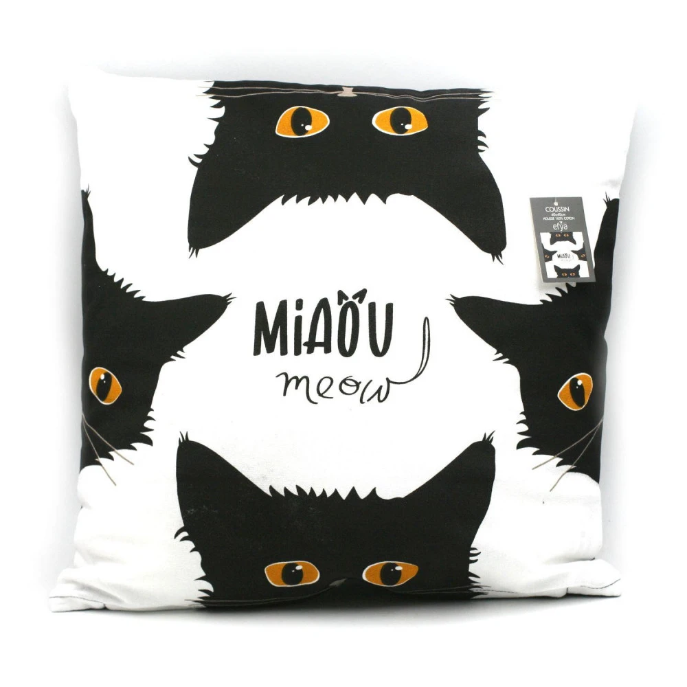 Joli coussin de la collection Meow, avec dessin de Chats noir sur fond blanc et l’inscription « Miaou Meow » au centre. 100% Coton, dimensions 40 x 40 cm