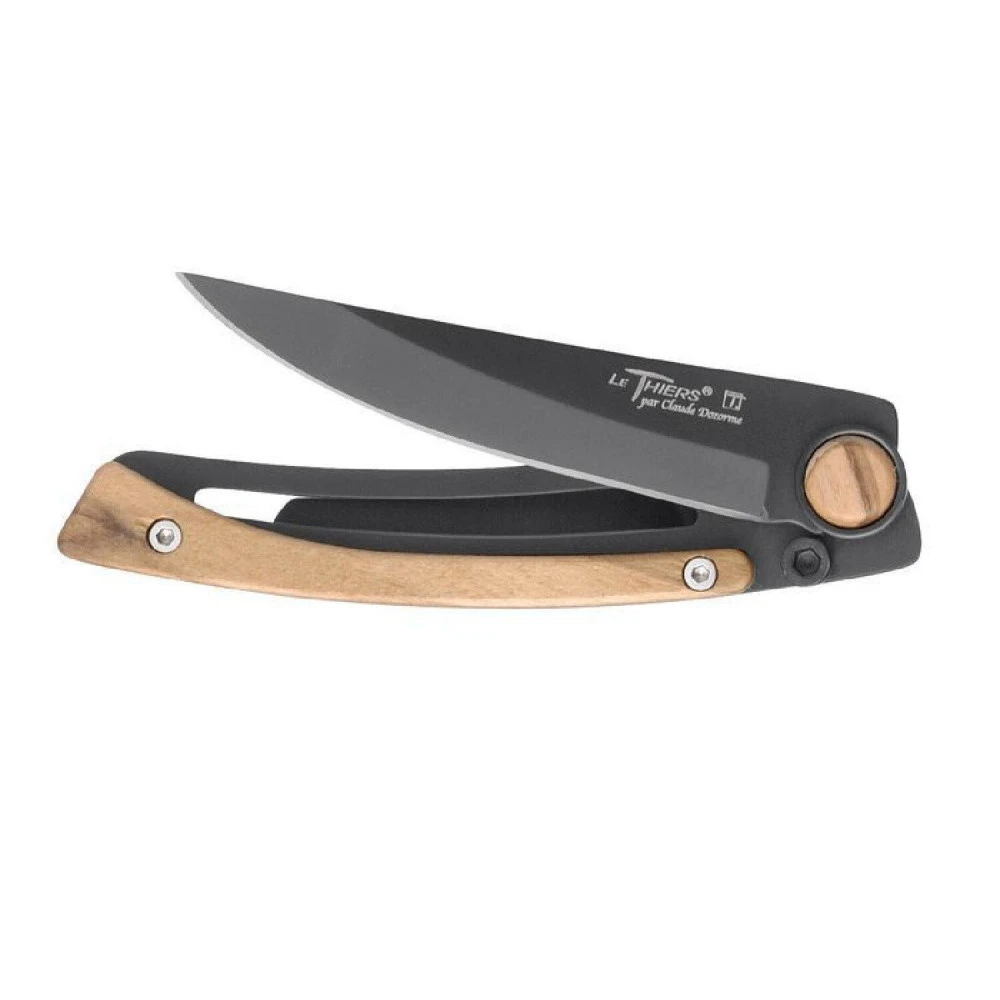 Ce couteau de marque LE THIERS par C. DOZORME, entièrement noir acier X50CrMoV15, lame à cran intérieur (en position fermée la lame entièrement plate du côté du manche reste apparente), manche 10,5 cm habillage olivier, avec clip ceinture/porte billets.