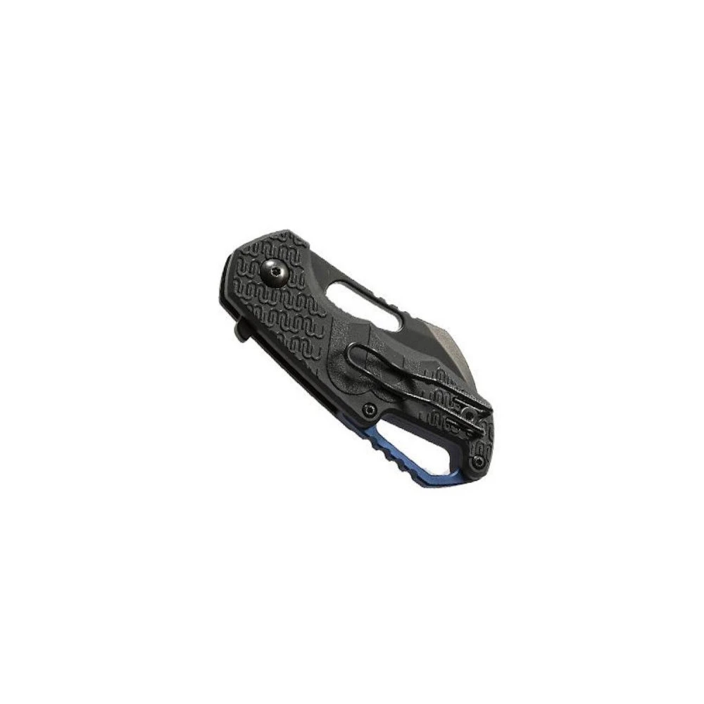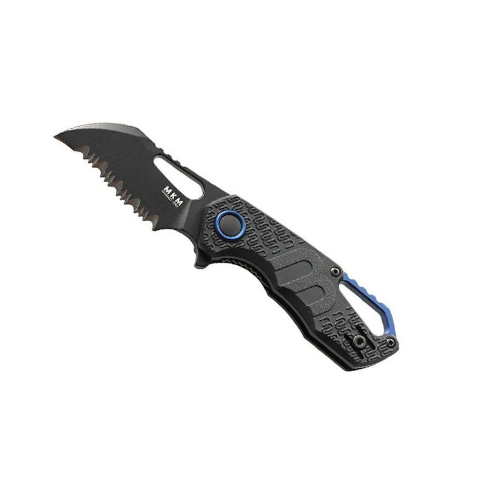Couteau pliant de la marque MKM « ISONZO » par FOX KNIVES, lame noire Hawkbill à dents et à trou acier N690Co avec « flipper », mécanisme « Ball bearing » et cran intérieur, manche 9 cm FRN noir, pivot et entretoise aluminium anodisé bleu, avec clip.