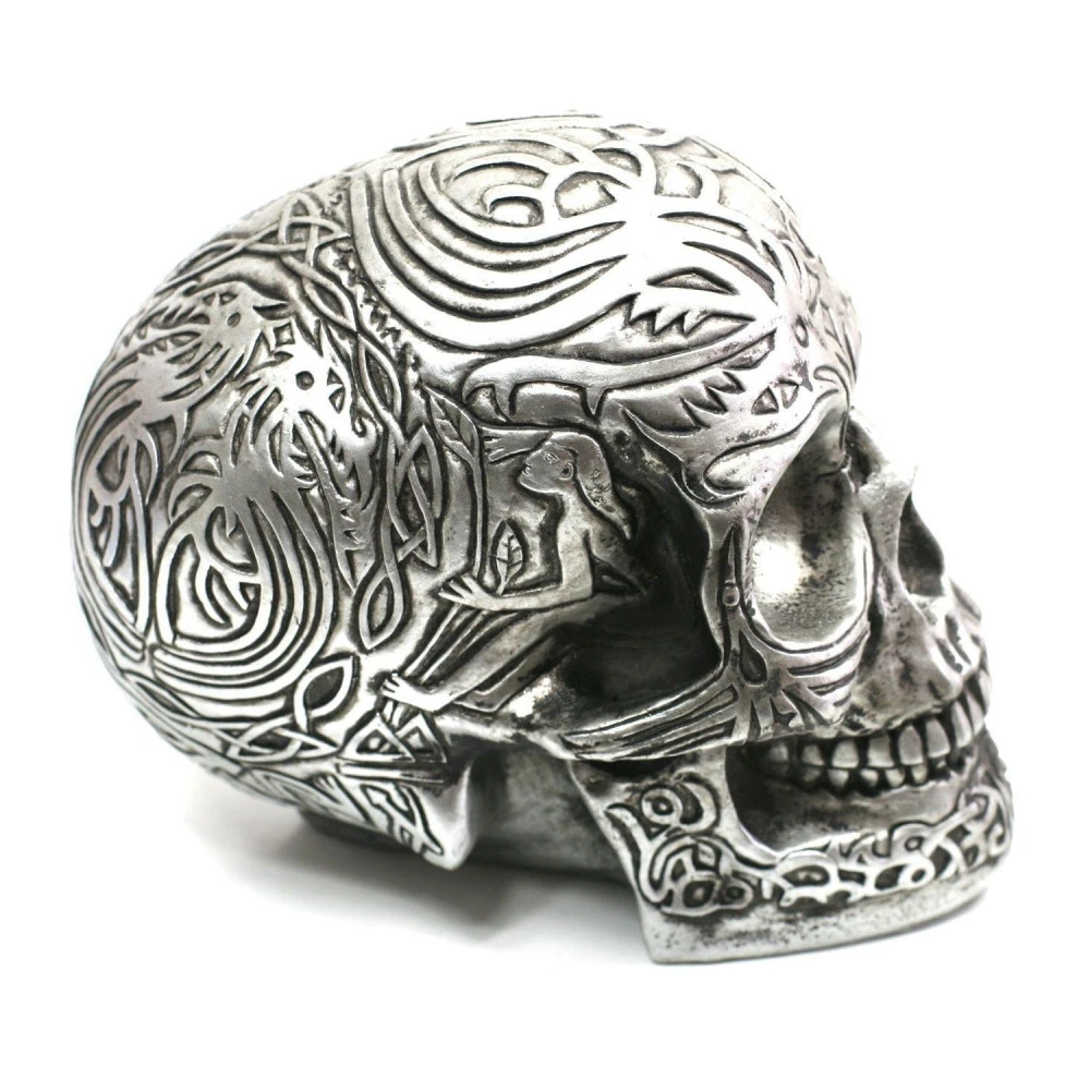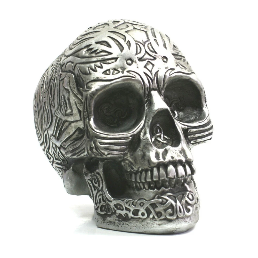 Ce crâne gothique en résine décoré de motifs à la couleur argent mesure 15,5cm (hauteur) et 10cm (largeur).