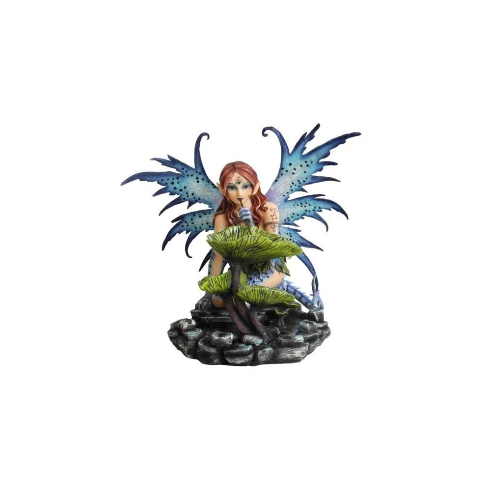 Cette fée en résine à été peinte à la main et possède de magnifiques ailes bleues.