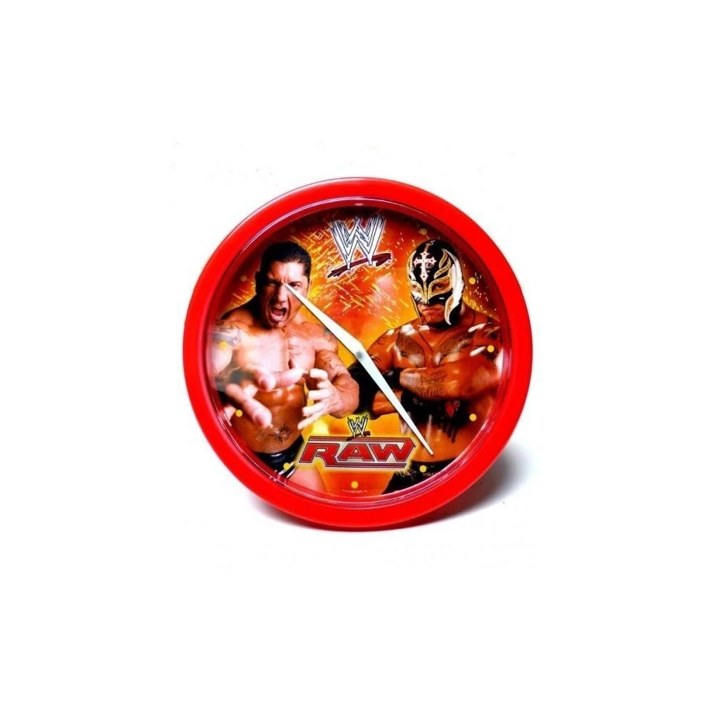 Horloge murale sur le thème du catch aux couleurs de Batista et Rey Mystério. Cadre plastique rouge . Nécessite une pile 1.5 V LR6 non fournie.