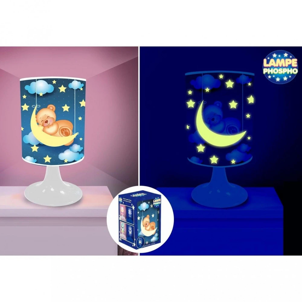 Cette lampe phosphorescente possède un dessin d’ouson et une lune entouré d’étoiles qui une fois dans l’obscurité continue de briller ! Idéal pour une chambre d’enfant.