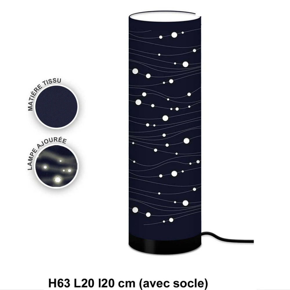 Lampe Tube 63 cm ajourée bleu nuitLes dessin ajourés se projettes sur les murs.Fonctionne avec une ampoule E14 (petit culot non fournie).Hauteur 63 cm diamètre 20 cm environ.Son fil est munit d’un interrupteur.