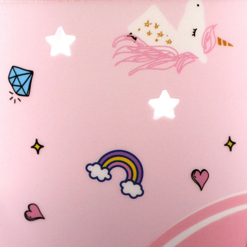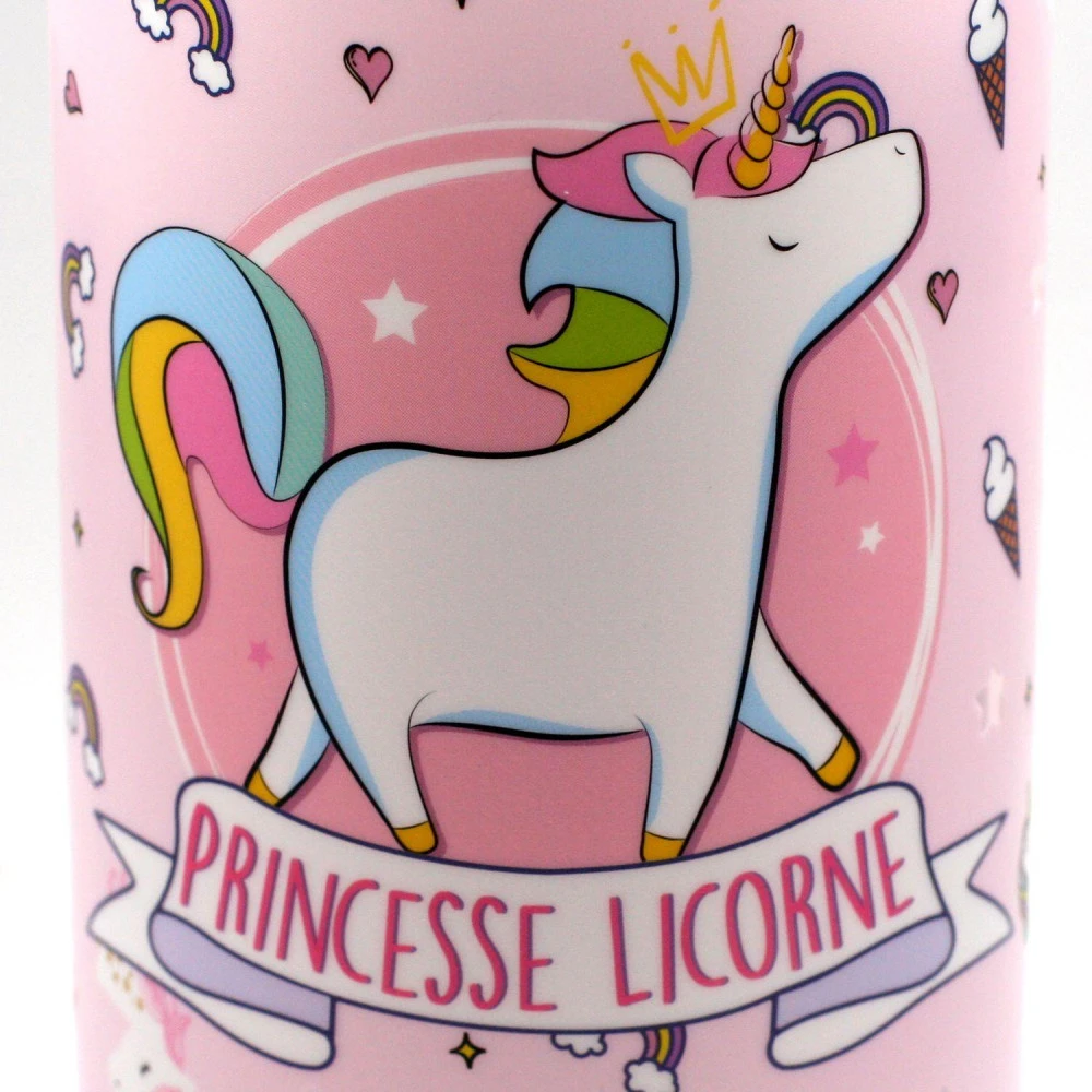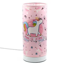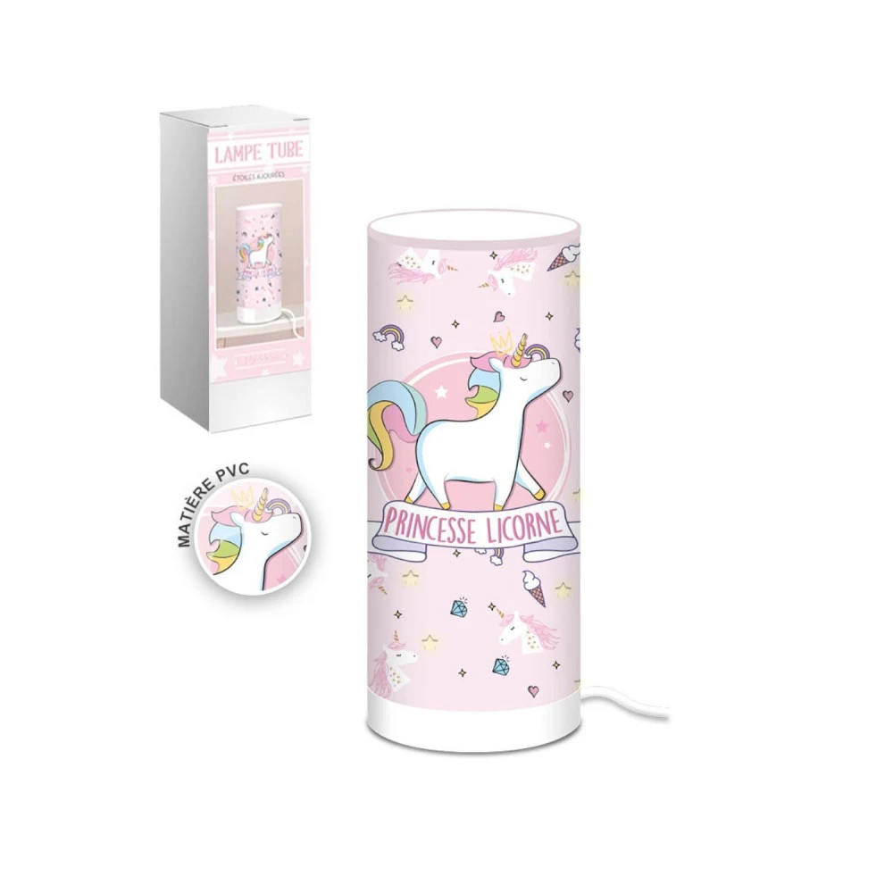 Lampe tube Licorne Princesse Hauteur de 27 cm et de 12 cm de diamètre.Branchement sur secteur.Le cable comporte un interrupteur.Fonctionne avec une ampoule E14 non fournie.Couleur rose, étoiles ajourées.