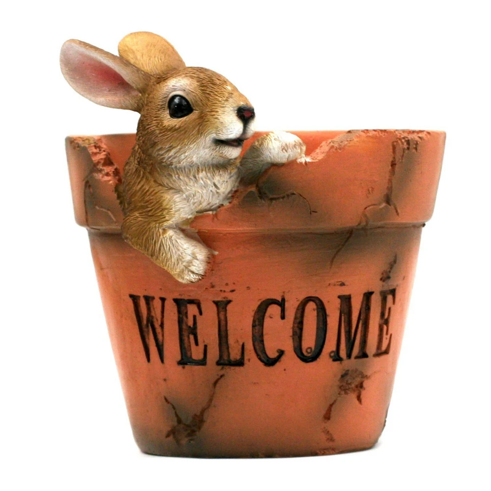 Lapin Cache Pot à Suspendre avec écrit « Welcome » (Bienvenu) pour une décoration extérieur accueillante. Avec un trou pou l’écoulement et un pour la suspension du produit.