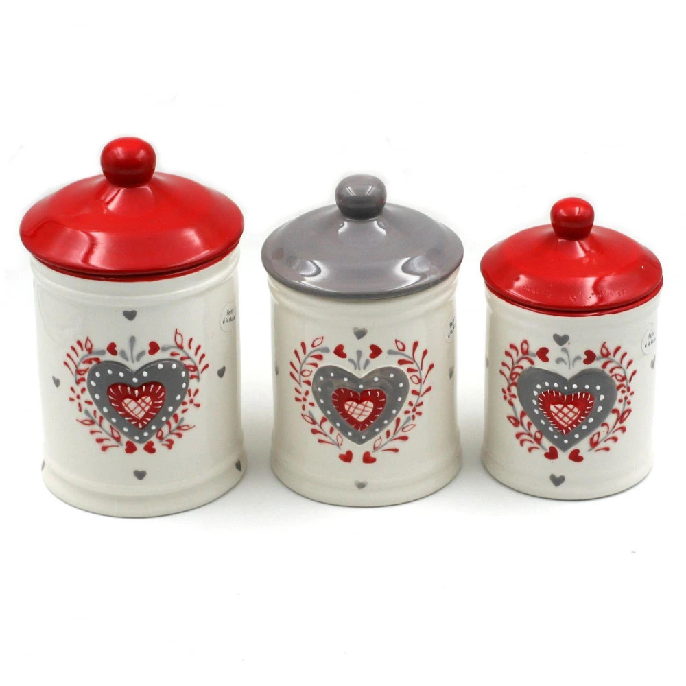 Décorez votre cuisine avec ces 3 pots au motif style Coeur Alsacien, 2 rouges et 1 gris. Parfait pour y mettre du sucre, du café, ou de la farine par exemple.
