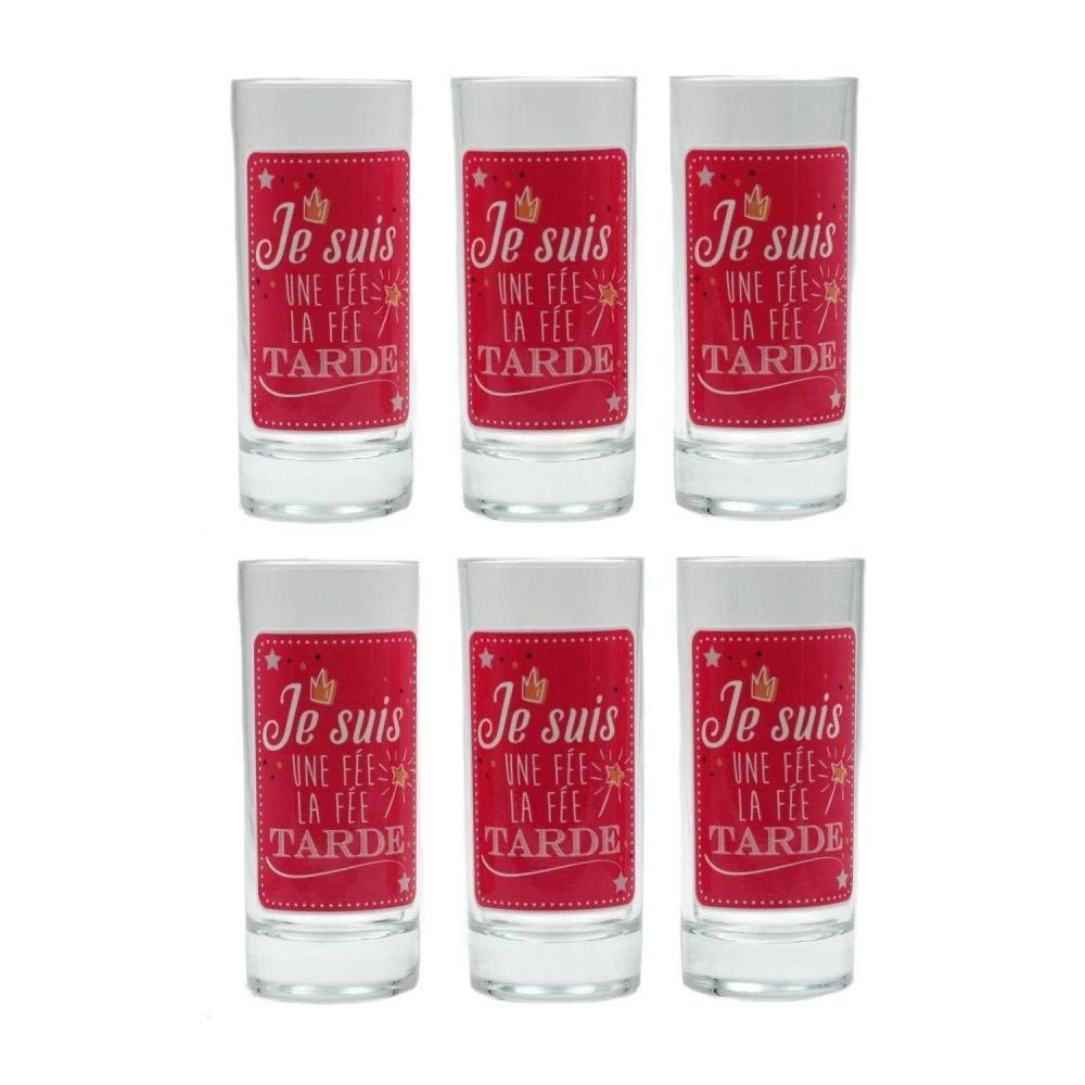 Un ensemble de 6 verres illustrés de l’expression « Je suis une Fée ! La Fée Tarde »