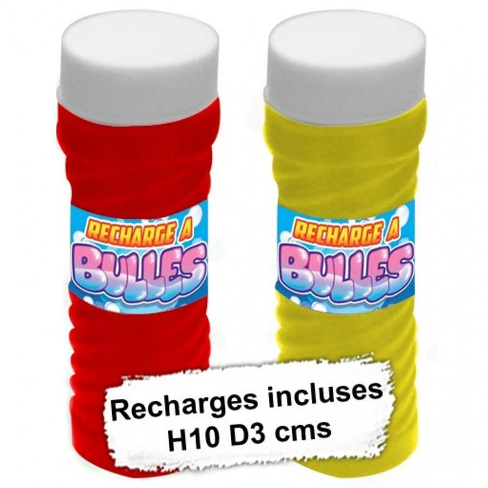 Cette machine à bulles est vendu en carton avec 2 Bouteilles de savon liquide (59ml). Necessite 4 piles R6 1,5V AA (non fournies).