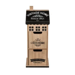 Découvrez cette jolie maison en bois aussi décorative que pratique, elle possède deux casiers tiroirs pour y ranger de petits objets du quotidien, comme par exemple des clés ou des portes feuilles. Un petit meuble de rangement parfait pour votre entrée, cet article en bois mesure environ 13 sur 34 cm de hauteur, retrouver sur ce produit des textes écrits en noir comme par exemple « Vintage Home » pour apporter un côté chaleureux à ce petit meuble