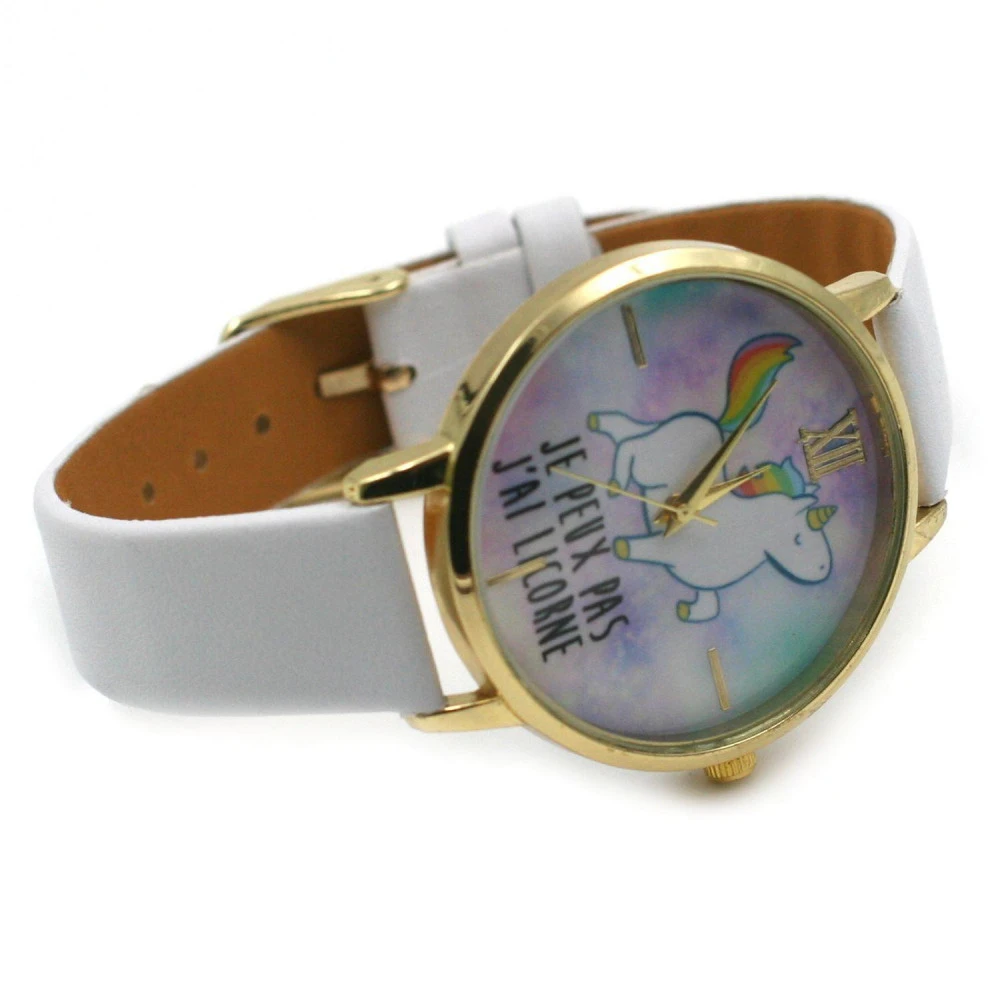 Cette montre est décorée d’une licorne et d’une petite phrase rigolote. La montre est monter sur un bracelet imitation cuir.