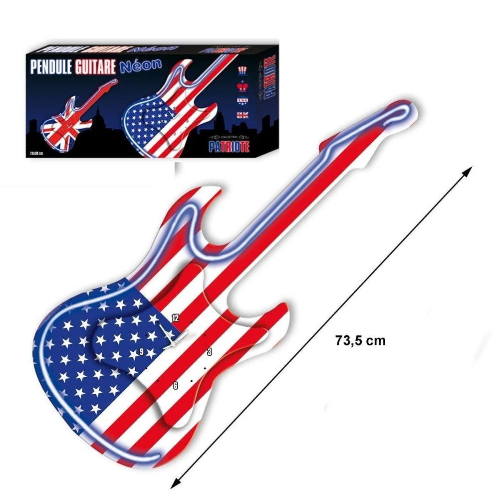 Pendule guitare Néon pour une déco américaine lumineuse ! Dimension de la guitare 73.5 cm. Alimentation 220 V avec transformateur. Fixations murales