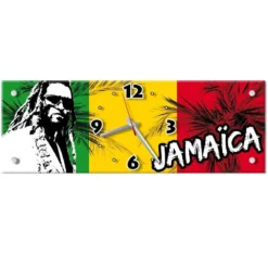 Pendule en verre sur le thème de la Jamaïque. Composé d’un décor aux couleur de la Jamaique et d’une plaque de verre biseautée montée sur entretoise. Système de fixation au mur. Nécessite une pile LR6 non fournie. Dimensions 57 x 20 cm