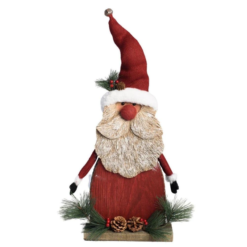 Père Noël dans du Bois découpé, décoration de Noël dans un style traditionnel. Déco à poser sur un meuble ou sur le sol, cet objet mesure environ 47 cm de haut. Avec des détails décoratifs comme une clochette à découvrir sur cet accessoire
