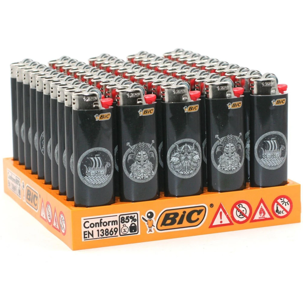 Plaquette complète avec 50 briquets BIC J26 (grand format) sur le thème des Vikings, avec 4 modèles differénts. Venez découvrir cette collection avec une illustration blanche sur un fond noir