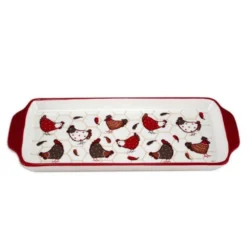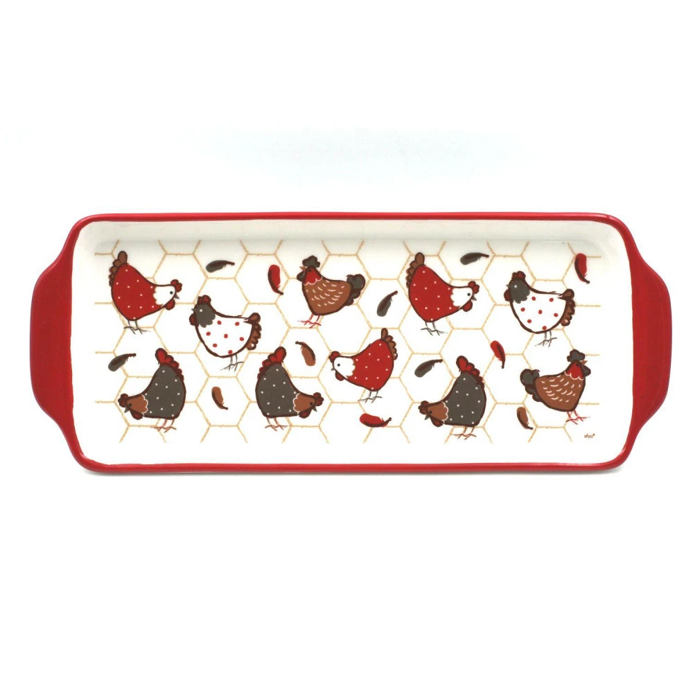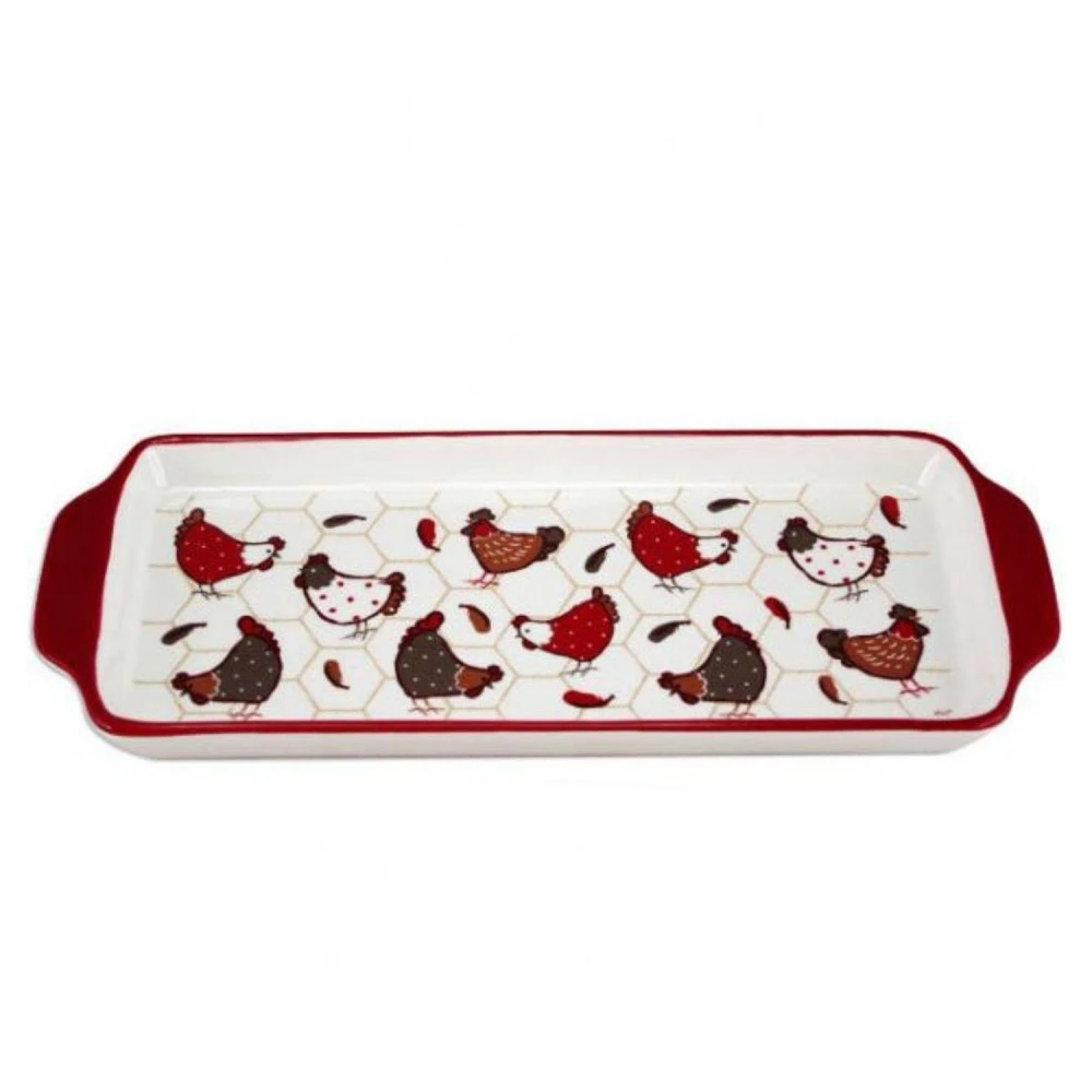 Plat rectangulaire (30 x 12 cm) en faience parfait pour vos cakes et gateaux, ce plat possède des motifs de Poules de la collection Cotty dans des tons Marrons/Rouges. Pour une décoration de cuisine pleine de caractère, ce plat peut aussi passer au lave-vaisselle et au micro-ondes