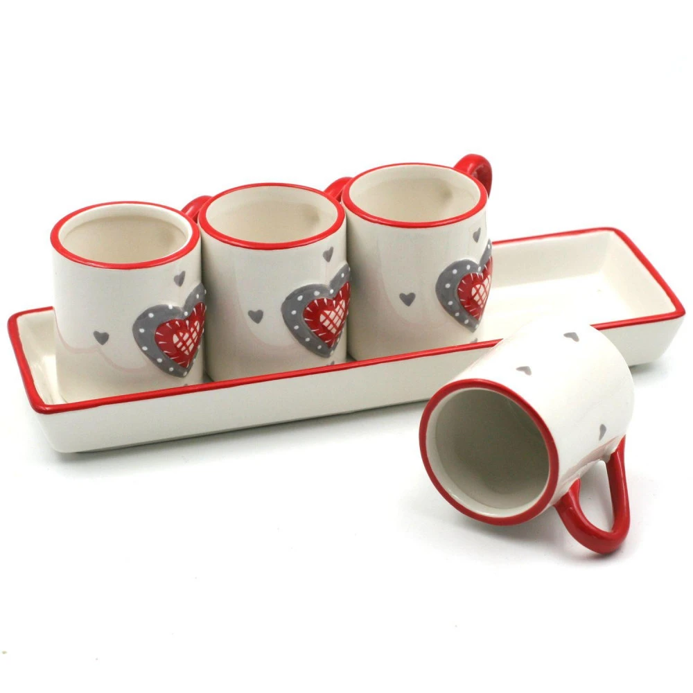 Dans le motif coeur découvrez ce set expresso avec 4 tasses ainsi que un plateau. Peint à la main. Dimensions : Plateau : 25 cm x 7.5 cm x 3 cm, Tasse : 7 cm de Hauteur et 5 cm de diamètre