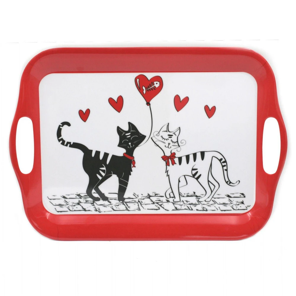 Plateau en mélaminé de la collection Choupy, bord rouge avec fond blanc et dessin de couple de chats. Ne passe ni au four ni au micro-ondes ni au lave-vaisselle. Dimensions 28 x 41 cm