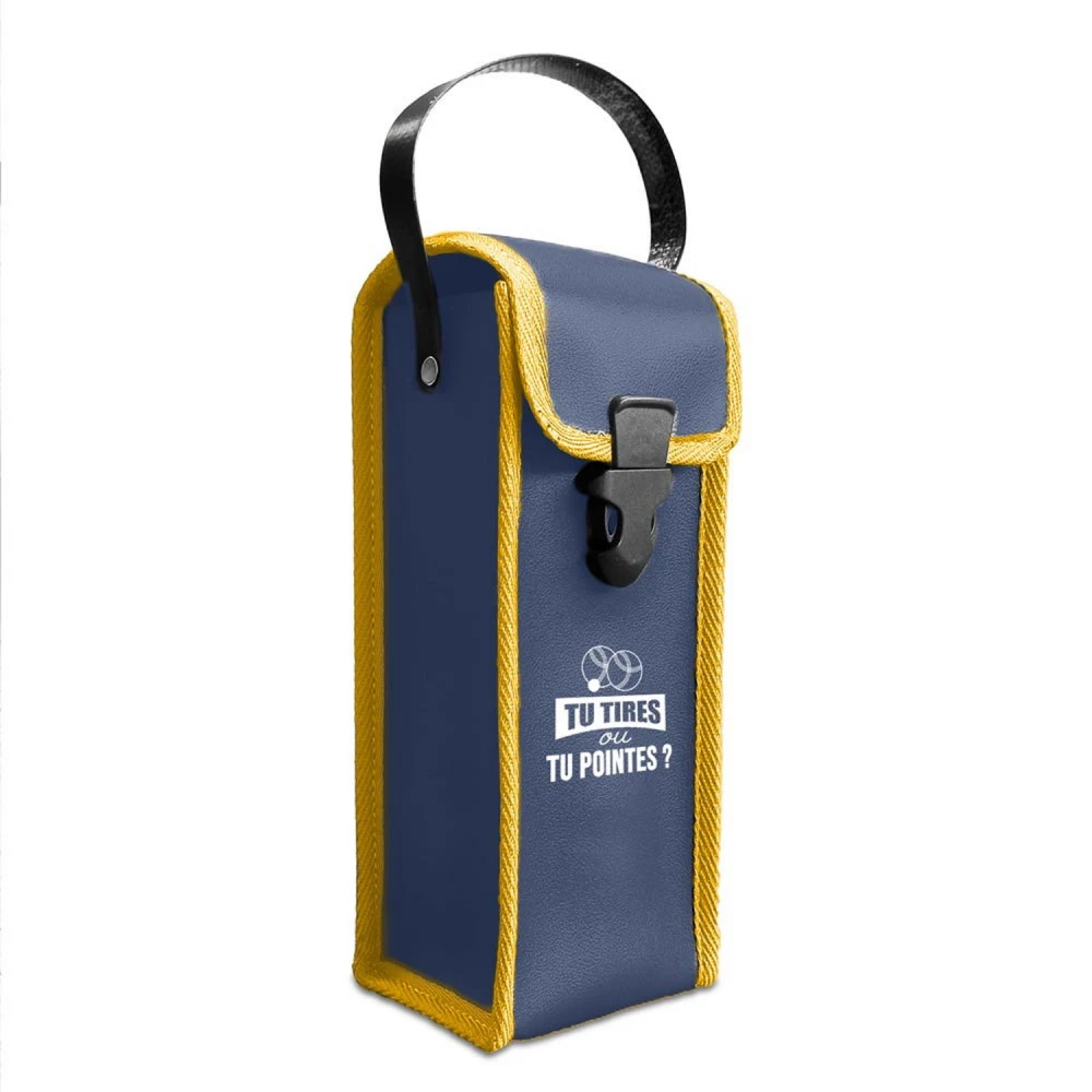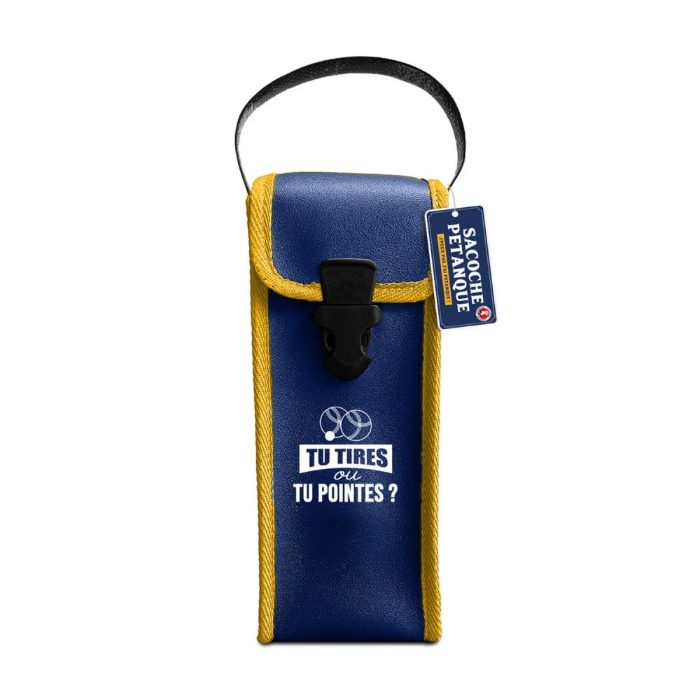 Jolie housse pour transporter vos boules de pétanque avec humour et style, modèle tu tires ou tu pointes ?. Cette pochette se ferme avec un système de clips à l’avant. Elle possède aussi une lanière en plastique pour le transport. La housse est composée de similicuir, elle peut être lavée à la main. Cette housse est vendue sans boule. Dimensions 8 cm x 25 cm