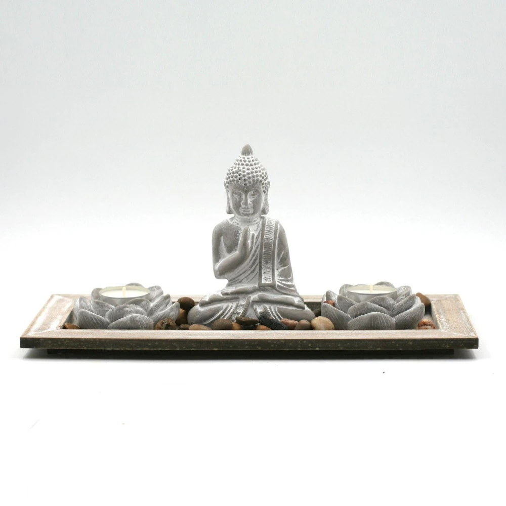 « Bouddha » désigne une personne sage qui a trouvé l’éveil, il représente le calme et la sérénité. Il se situe au milieu des deux bougies. Une décoration zen et lumineuse pour apporter des ondes positives dans votre foyer. Dimensions 35 x 14 x 14.5 cm