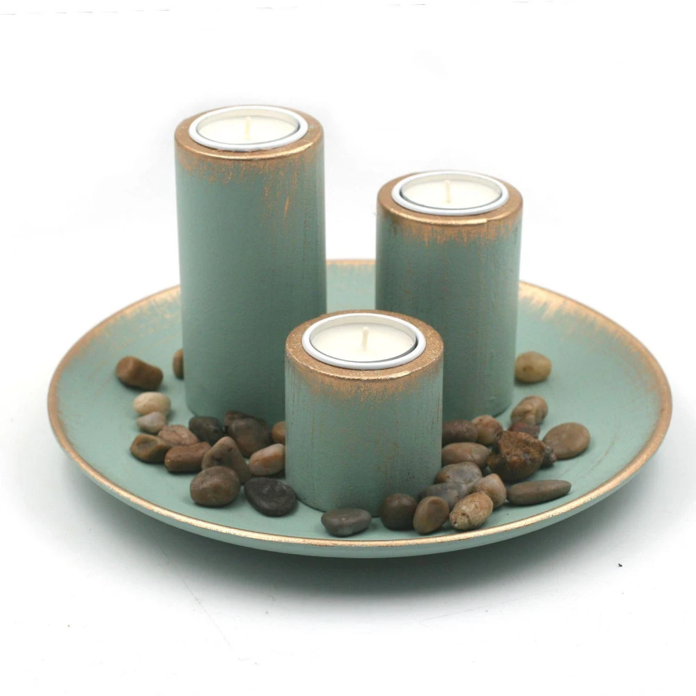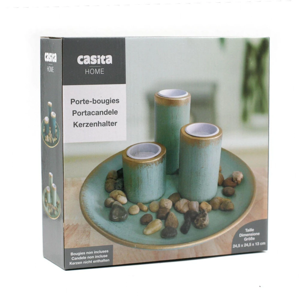 Peut contenir 3 Bougies, sur un plateau rond, dimensions environ 24.5 x 24.5 x 13 cm