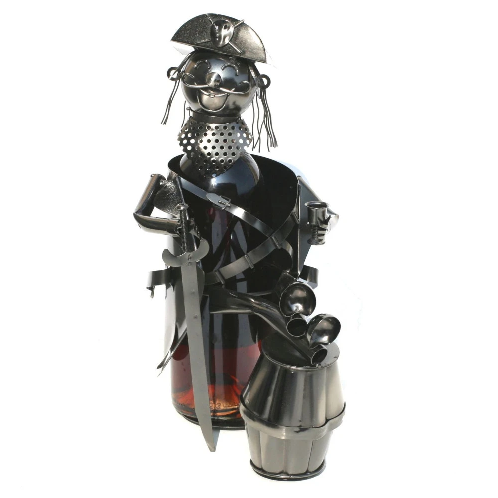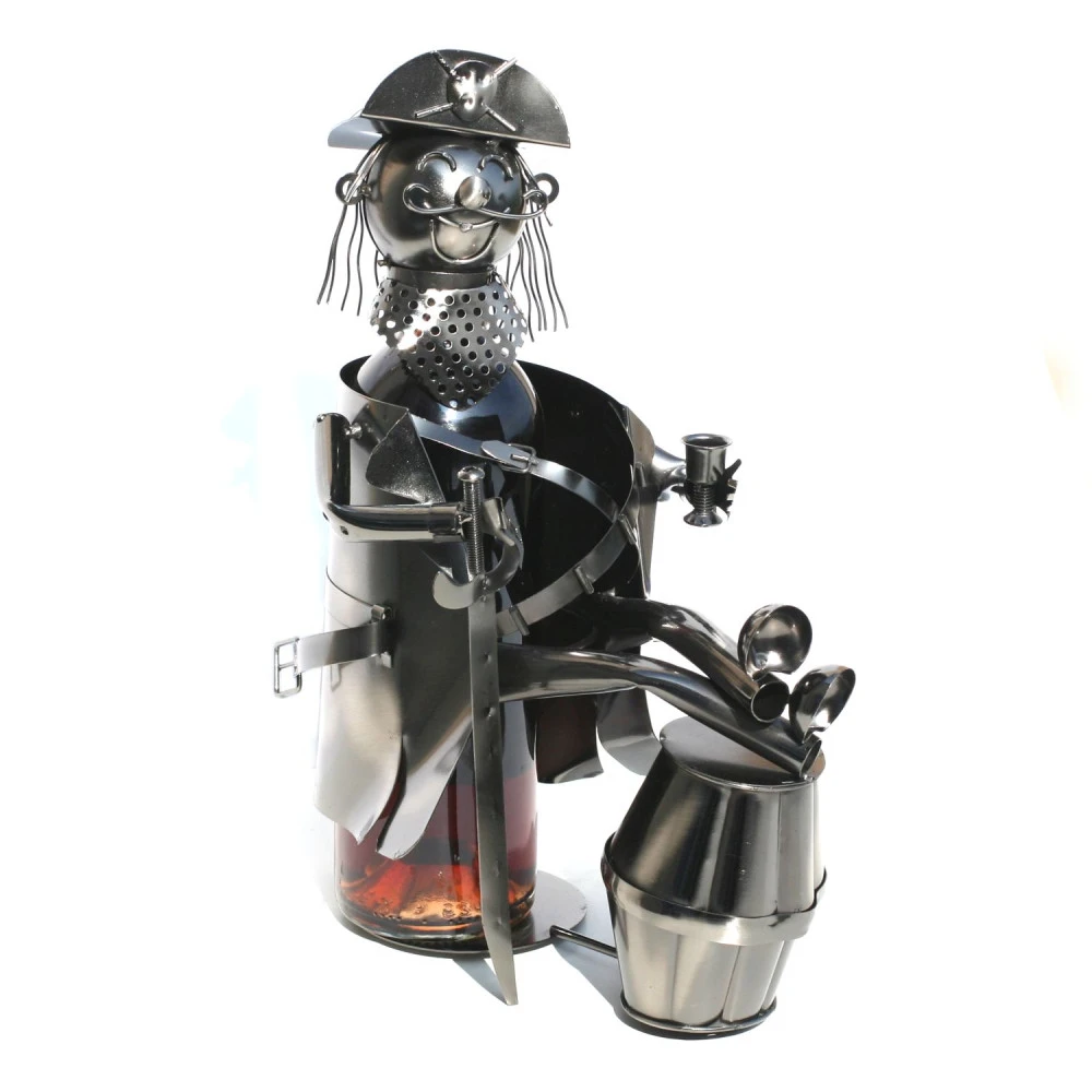 Le porte-bouteille en métal en forme de pirate est un accessoire décoratif pratique et esthétique conçu pour présenter élégamment une bouteille de vin ou d’eau sur une table.