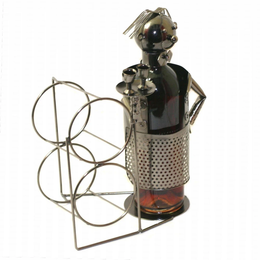 Porte bouteille en métal modèle Serveur, avec un emplacement dans la partie du personnage et deux emplacements sur le côté. Une façon originale de présenter vos bouteilles, il peut faire l’objet d’un cadeau à un proche. Dimensions 35 x 25 x 20 cm