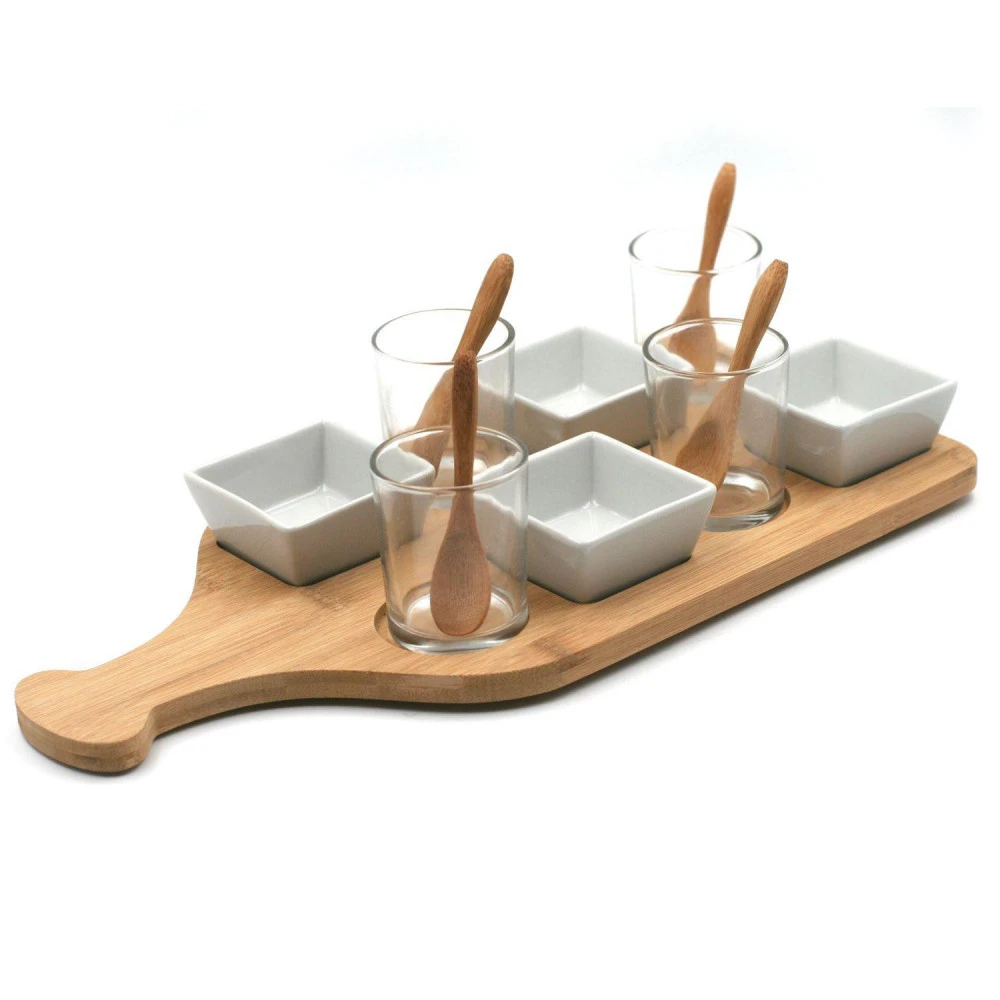 Jolie set pour l’apéritif, contient 4 cuillères, 4 verrines, 4 ramequins et un plateau