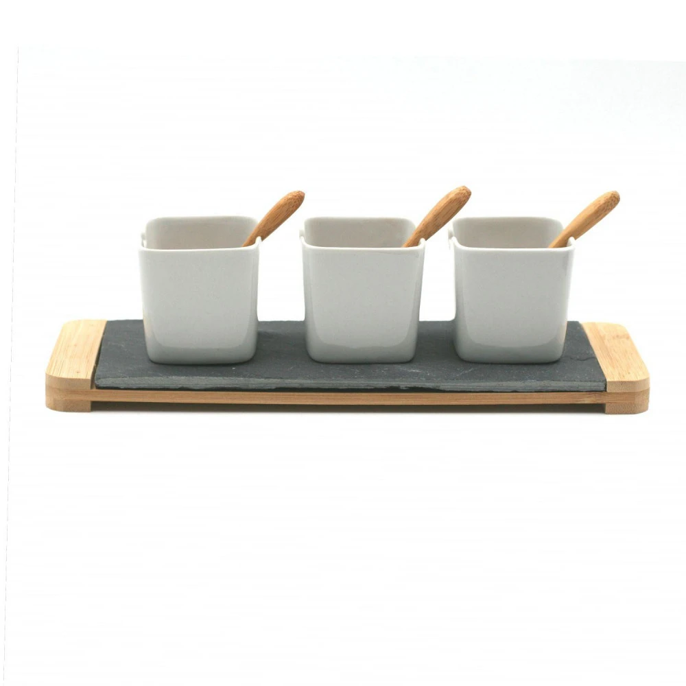 Set Apéritif contenant 3 ramequins, 3 cuillères, un plateau et une plaque en ardoise