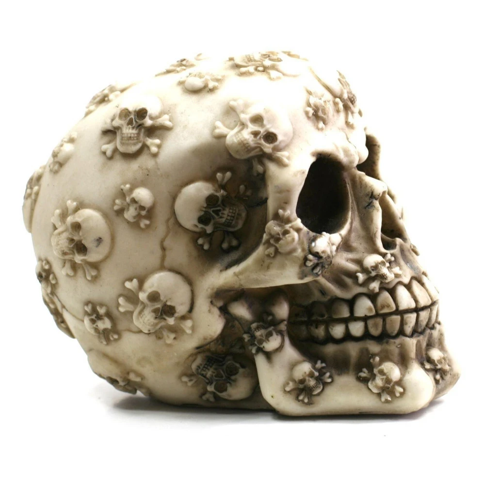Cette statuette de crâne gothique est en résine décoré de multiples têtes de mort.