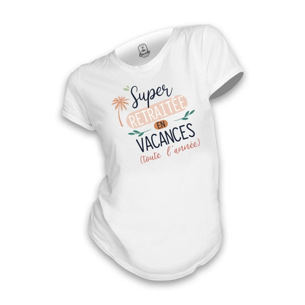 Un cadeau original pour un départ en retraite, ce superbe T-Shirt est illustré et possède l’inscription « Super Retraitée en vacance toute l’année ». Article en taille M, fabrication 100% coton avec un grammage de 160 g/m2, une coupe ajusté possédant un col rond