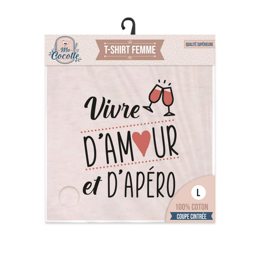 T-Shirt pour femme à offrir, coloris rose avec la phrase humoristique « Vivre D’Amour et D’Apéro ». Avec un col rond, ce t-shirt 100% coton possède un grammage de 160 gr/m², taille L. Le cadeau idéal pour faire plaisir à sa partenaire !