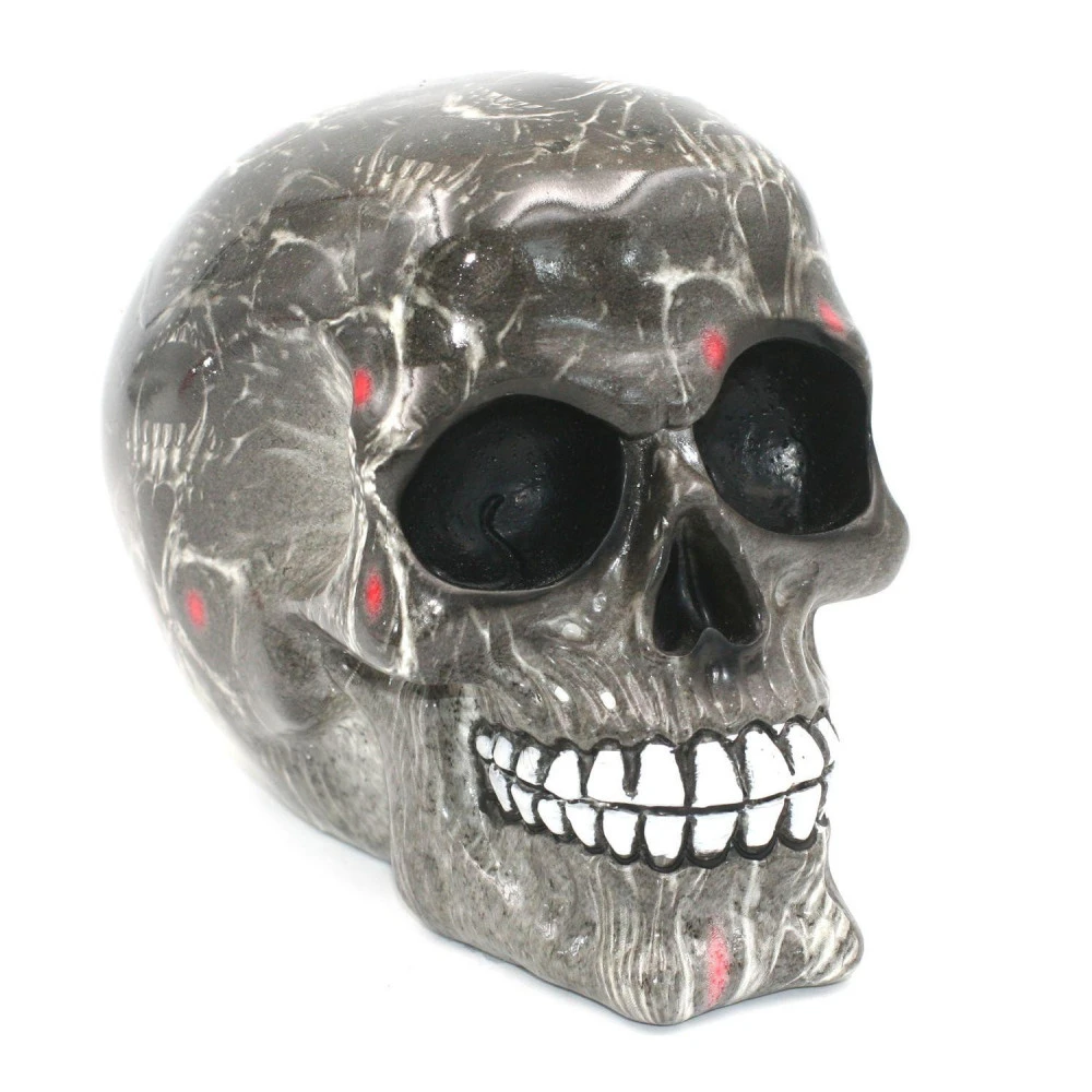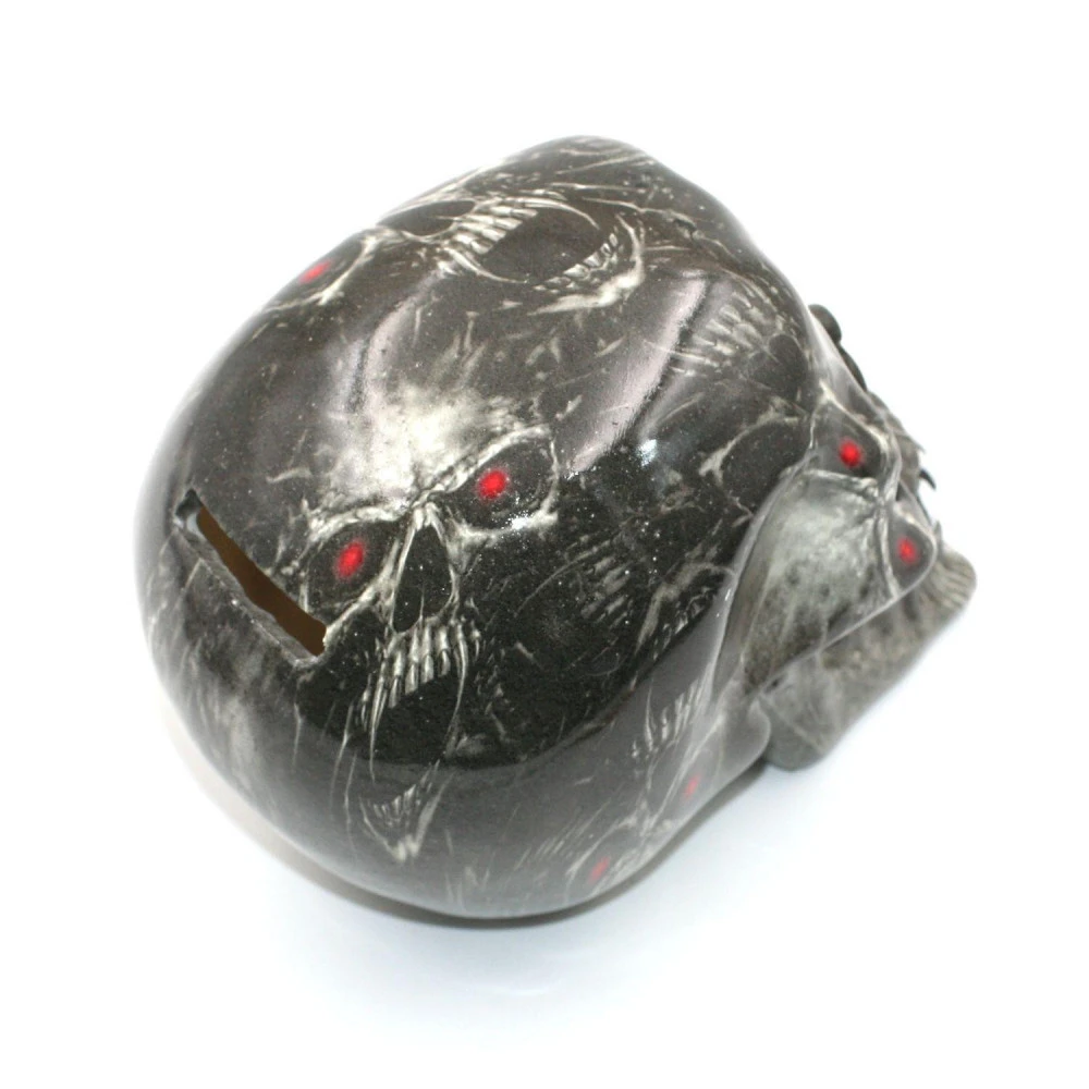 Tirelire originale en forme de tête de mort avec un effet brillant et un motif de crânes enragés