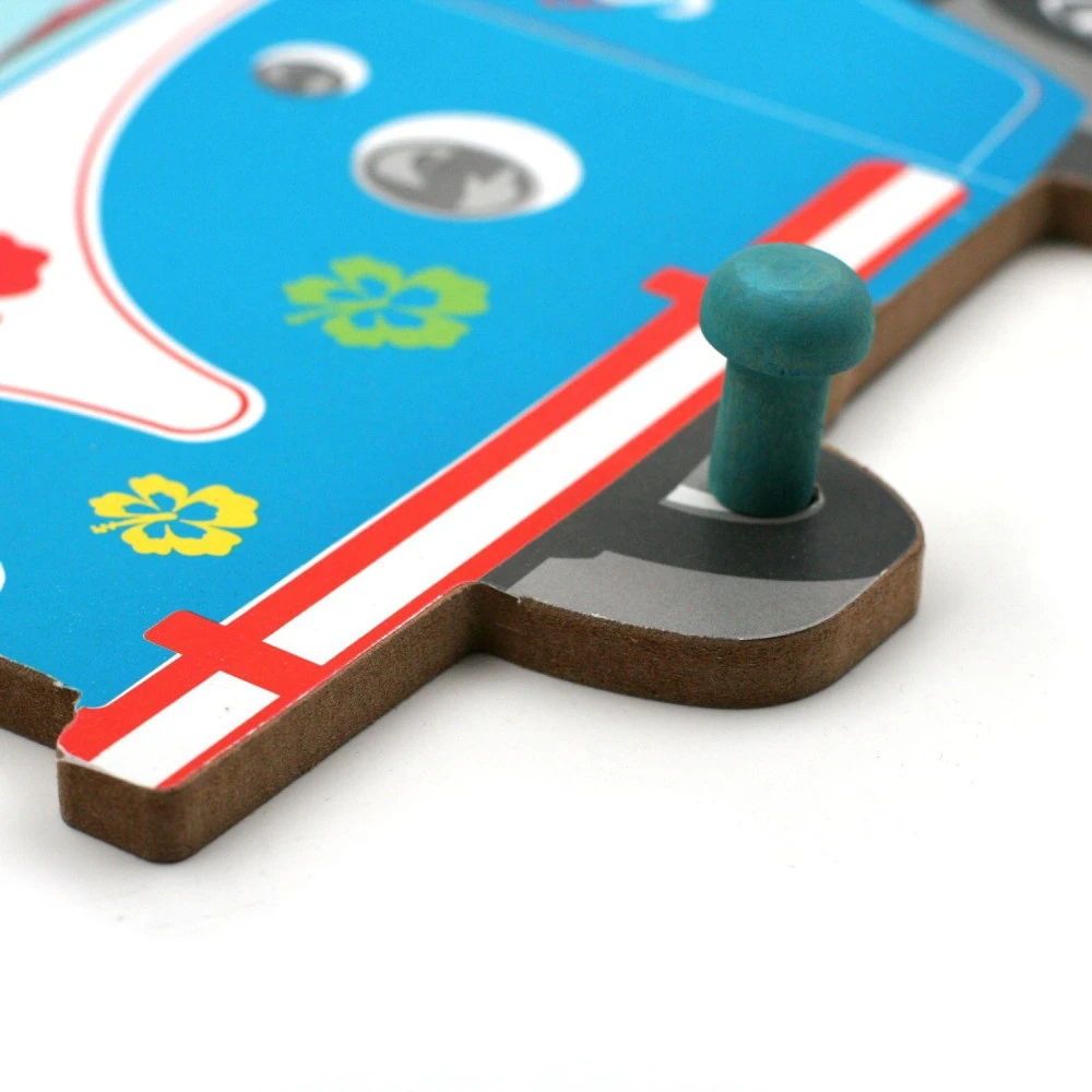 Objet décoratif et pratique en bois de 33 x 20 cm, en forme de Van Bleu avec des planches de Surf. Possède 3 Patères en bois, et deux fixations en métal à l’arrière pour accrocher à un mur